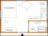 Im einfachen Stil eingerichtet bietet Ihnen das Gästehaus einen Wohnraum mit Küchenzeile, Waschmaschine, Ofen, Doppelbett, Schrank und Essecke, sowie ein Badezimmer mit Dusche, Waschbecken und WC. |